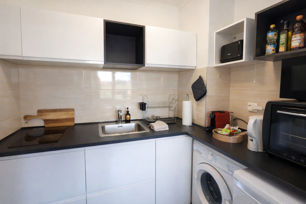 Mixer, Kinderhochstuhl, Kaffeemaschine, Küchenausstattung, Küchenherd, Kochnische, Mikrowelle, Backofen, Kühlschrank, Gewürze, Toaster, Staubsauger